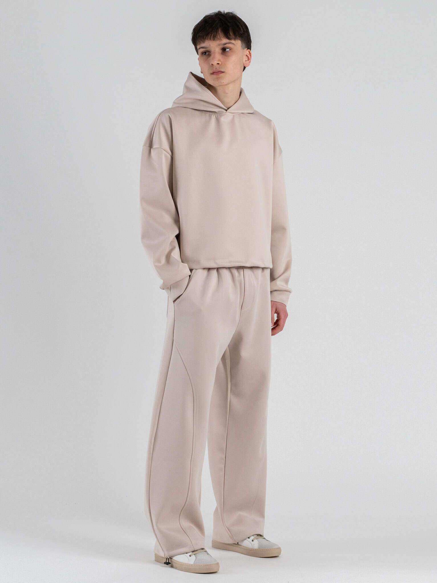 Il coordinato crop in tessuto scuba è un set dal design contemporaneo e deciso. Il top crop valorizza la silhouette con un tocco moderno, mentre il pantalone balloon crea una linea ampia e strutturata, garantendo comfort e stile. Il tessuto scuba assicura una vestibilità fluida ma sostenuta, ideale per un look curato e di tendenza. Il colore beige dona luminosità ed eleganza minimal, rendendo il coordinato versatile e facile da abbinare anche separatamente. Perfetto per outfit urbani, casual fashion e tempo libero. Indossato insieme trasmette una sensazione di comfort, stile moderno e personalità decisa.