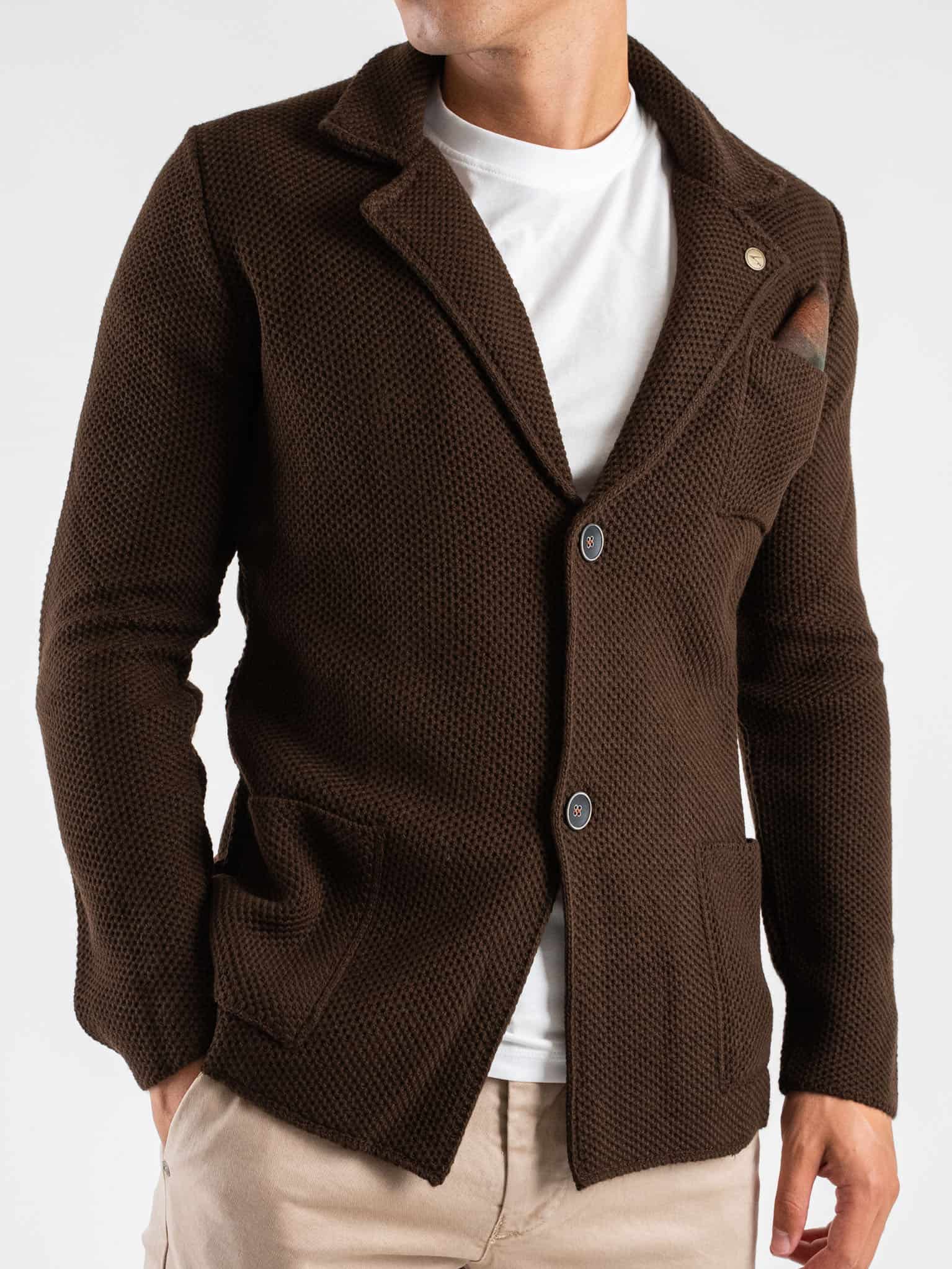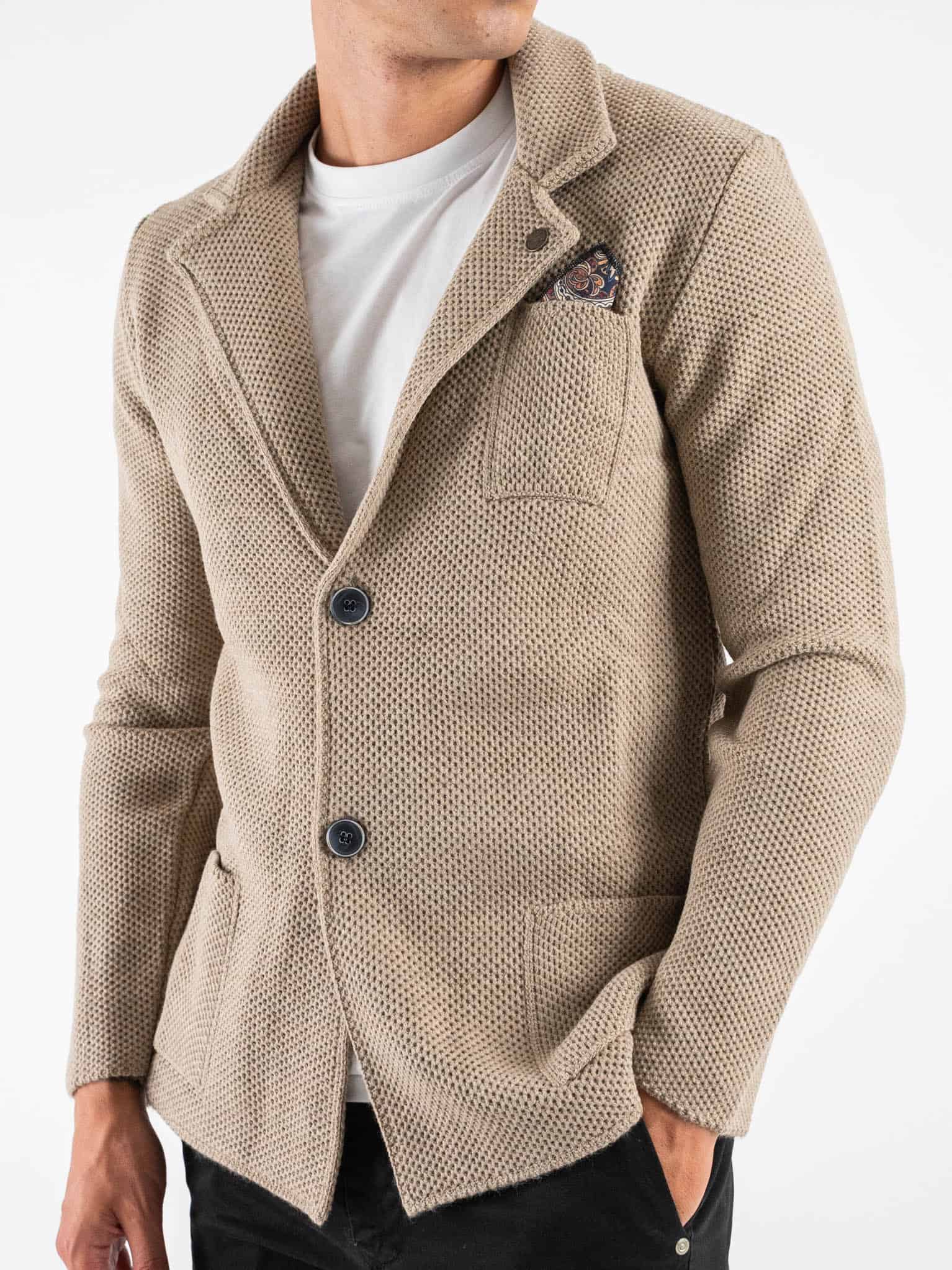 V2 Giacca in maglia misto lana lavorata occhio di pernice monopetto con pochette GUOPE Blu