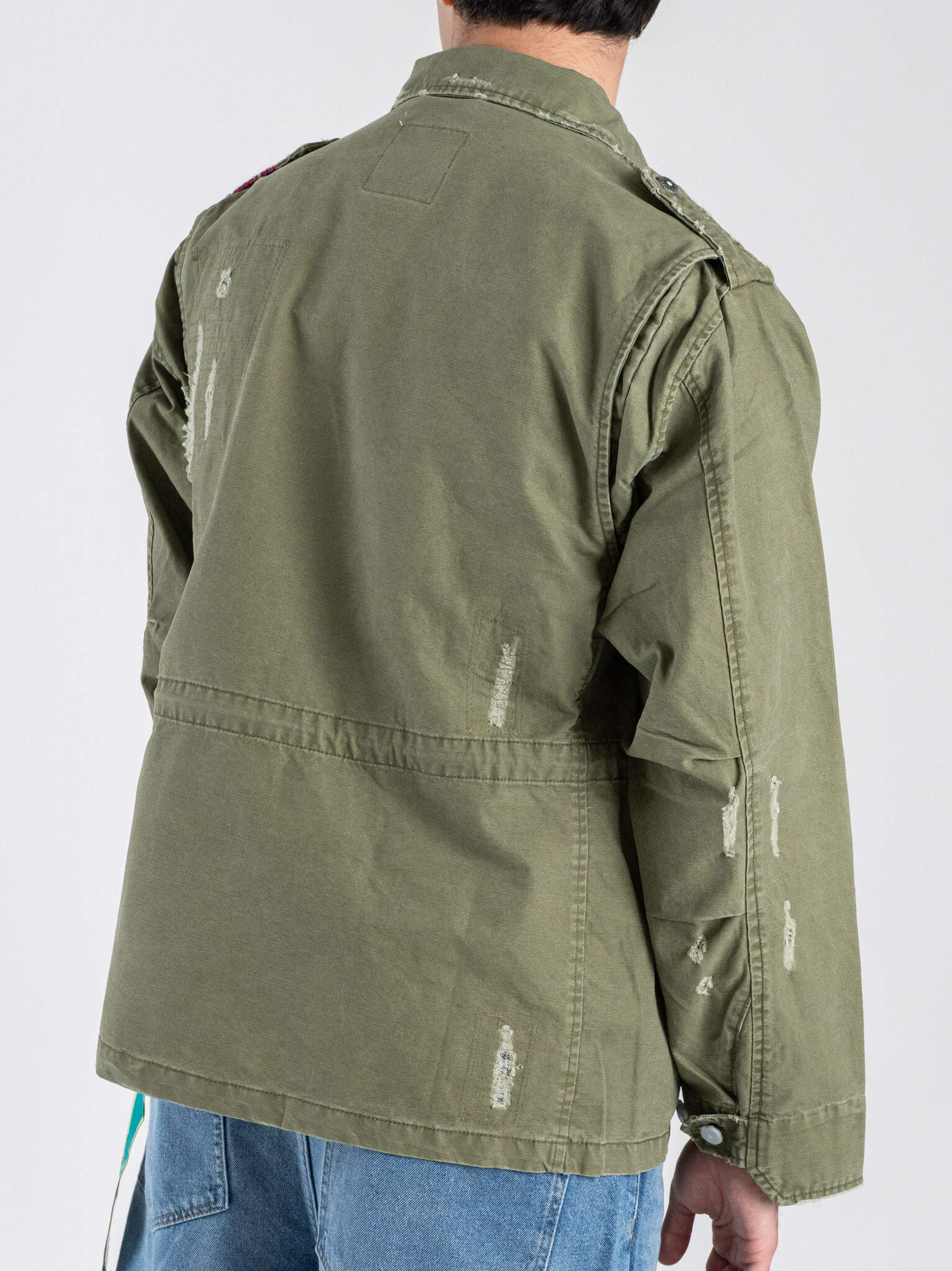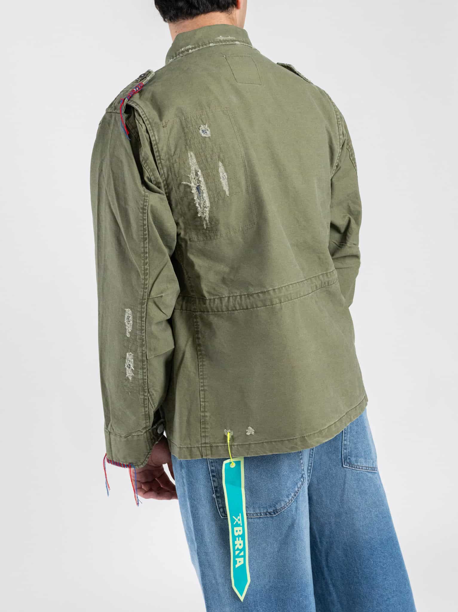 Le rotture strategiche e i ricami colorati aggiungono un tocco originale e creativo, trasformando la sahariana in un capo unico e di tendenza. Il colore verde militare conferisce grinta e carattere, rendendo il capo perfetto da abbinare a jeans, pantaloni cargo o bermuda per outfit casual, urban o streetwear.