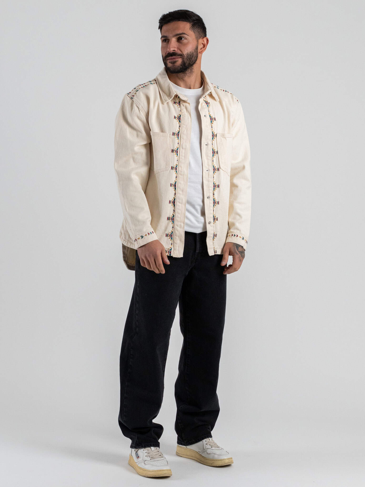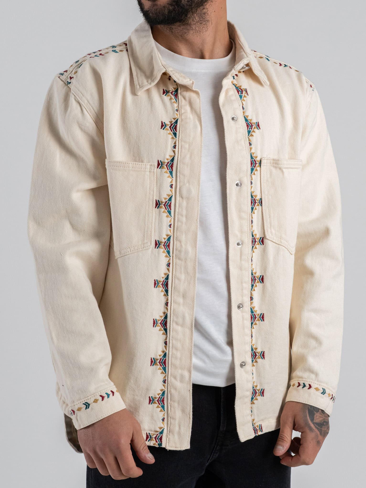 Le tasche frontali aggiungono funzionalità, mentre i ricami colorati donano carattere e originalità al capo, rendendolo unico e moderno. Il colore sabbia conferisce luminosità e naturalezza, facilitando gli abbinamenti con jeans, pantaloni chino o bermuda per look casual e urban chic.