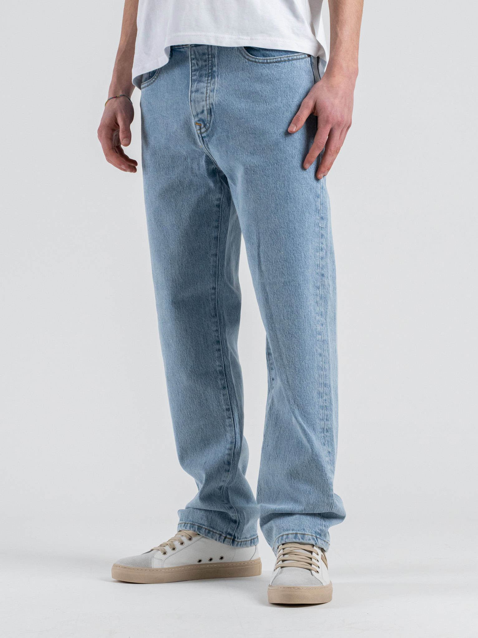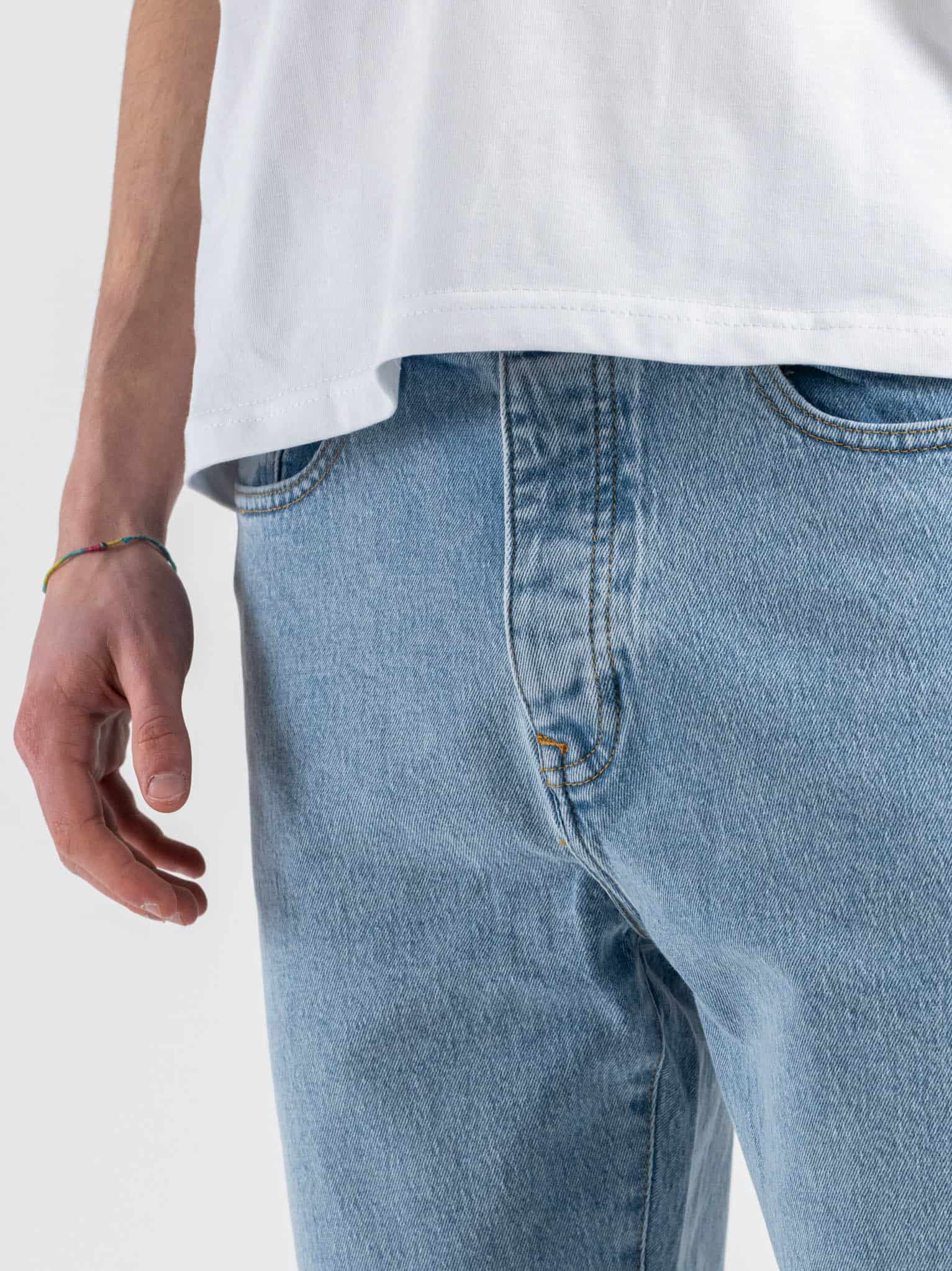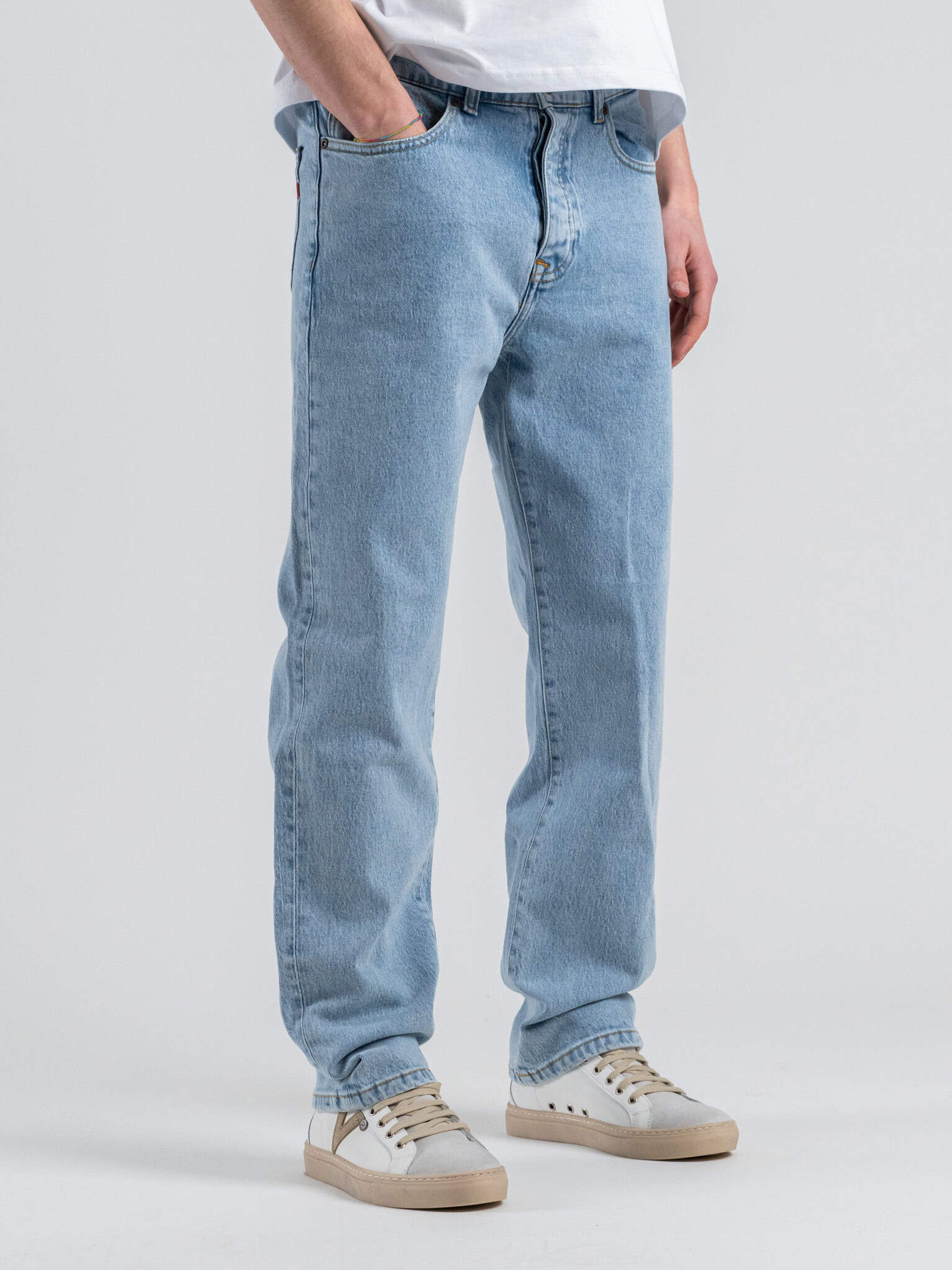 Il fit regular offre una linea equilibrata e comoda, ideale per diverse silhouette. Il lavaggio light blue dona freschezza e un aspetto casual, perfetto per la stagione primaverile ed estiva e facile da abbinare a T-shirt, camicie o felpe leggere.