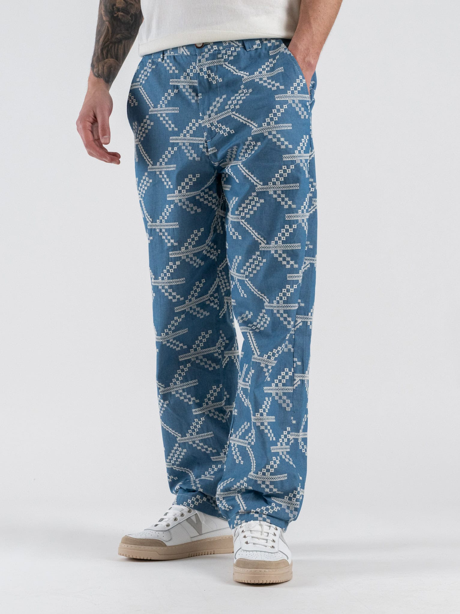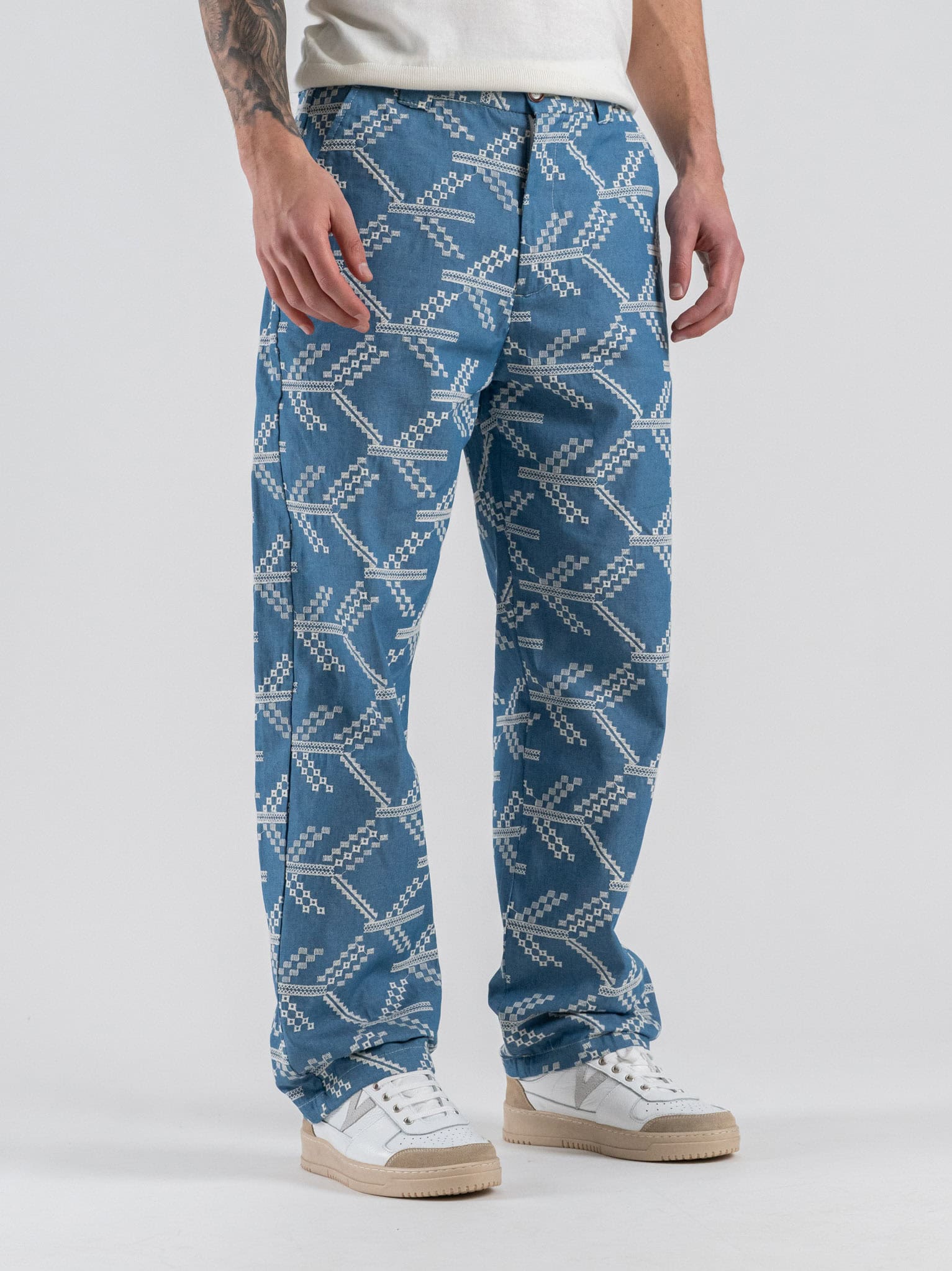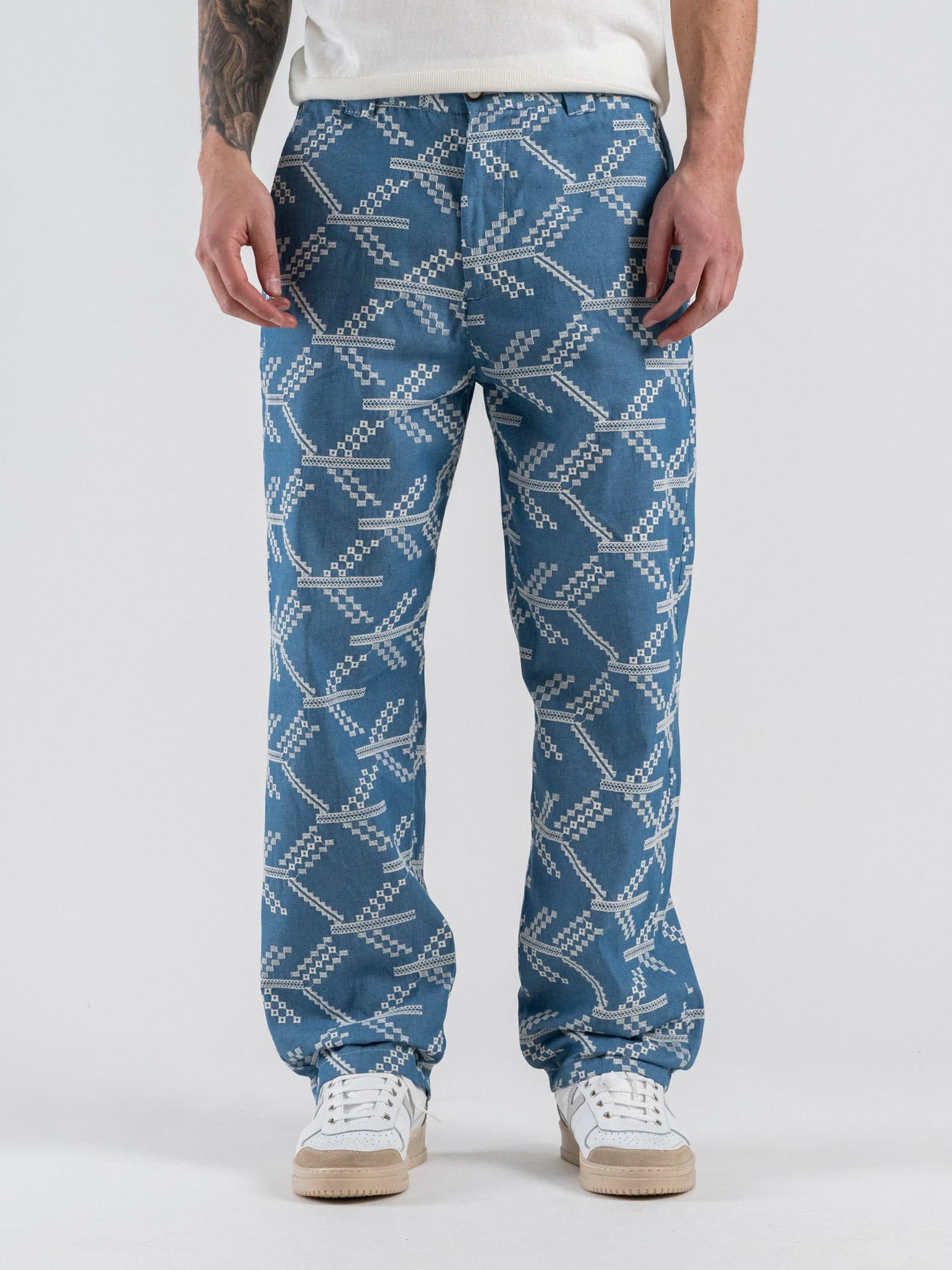 La vestibilità loose fit dona un look rilassato e moderno, mentre i ricami decorativi aggiungono originalità e personalità al design. Il colore azzurro conferisce freschezza e luminosità, rendendo il pantalone facile da abbinare a T-shirt, camicie o felpe per look casual chic o streetwear.
