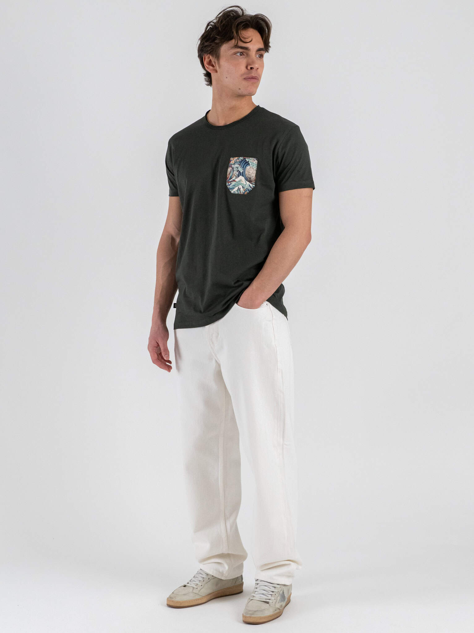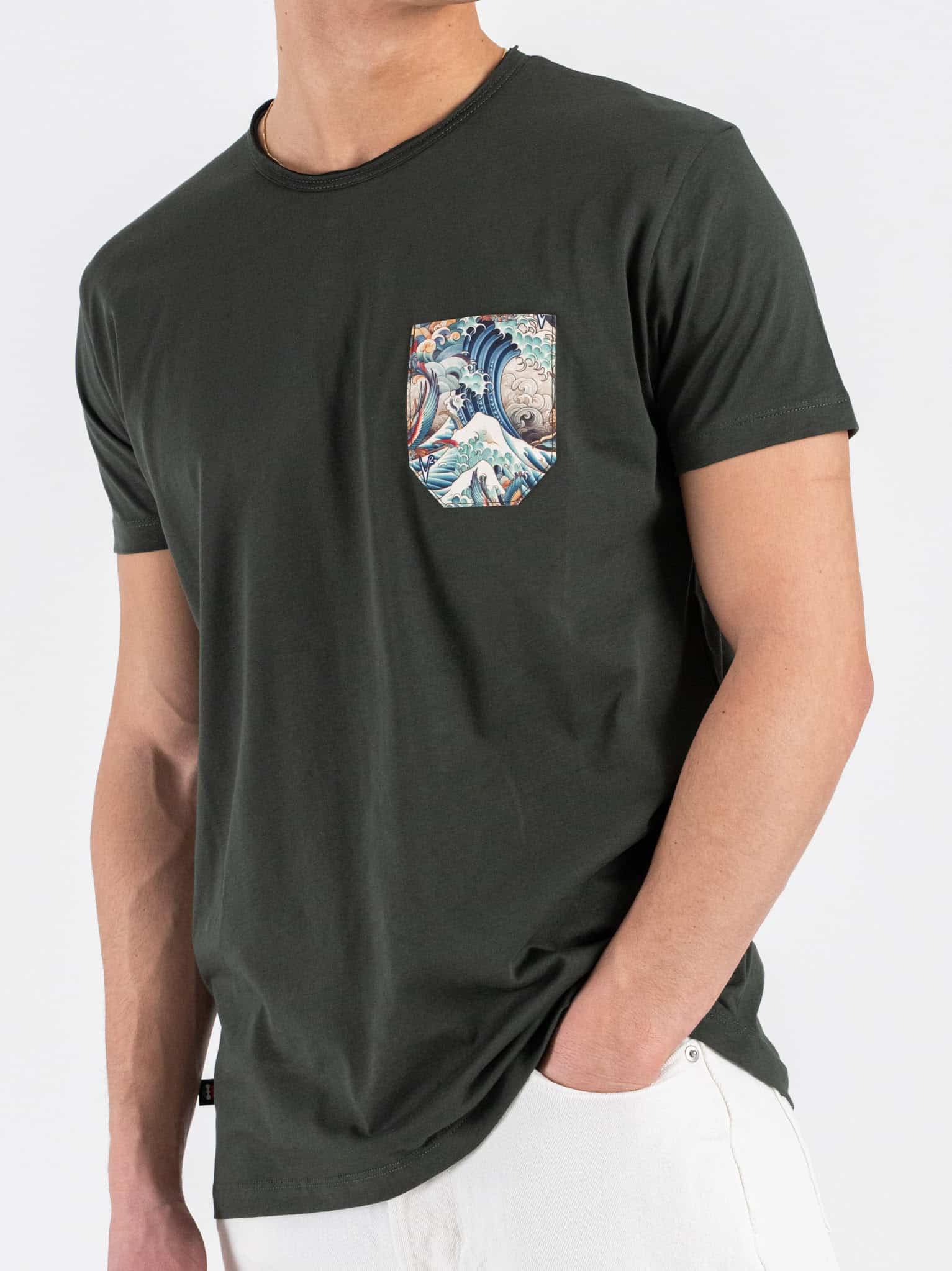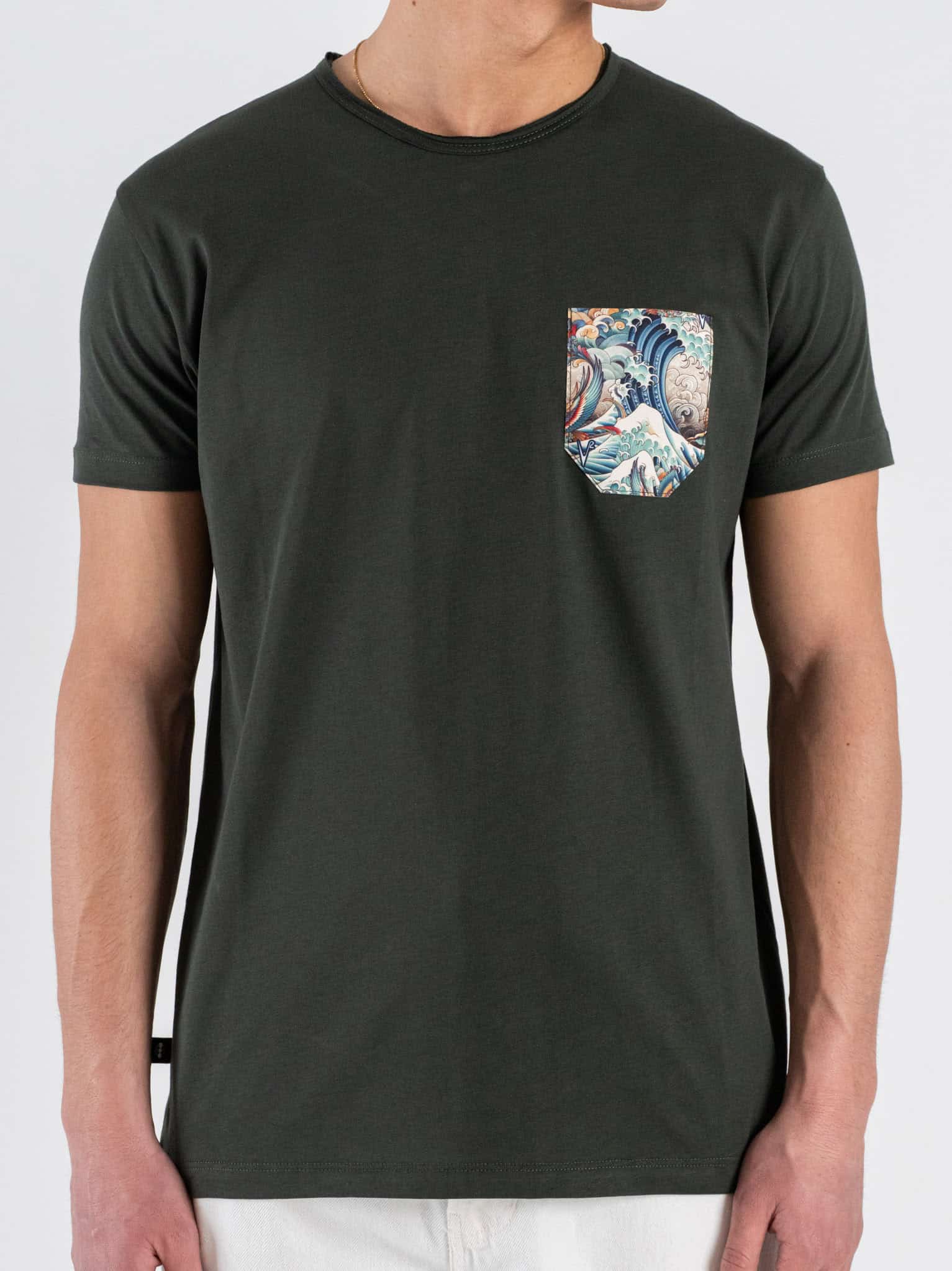 La T-shirt basica con taschino a fantasia onde colorate firmata V2 è un capo semplice ma ricco di personalità. Il taschino decorato con motivo a onde colorate aggiunge un dettaglio distintivo e creativo, rendendo la T-shirt unica senza appesantire il design.