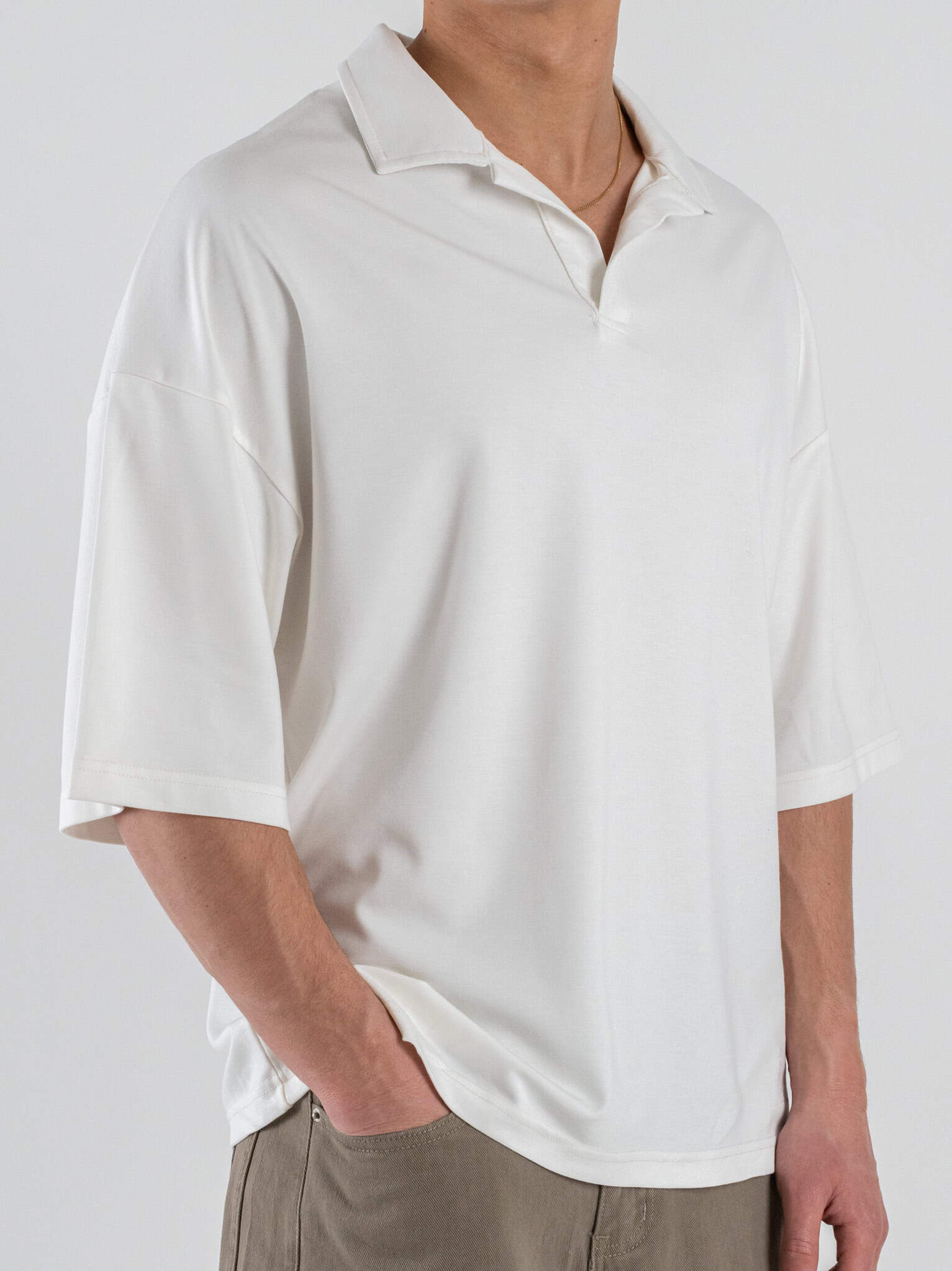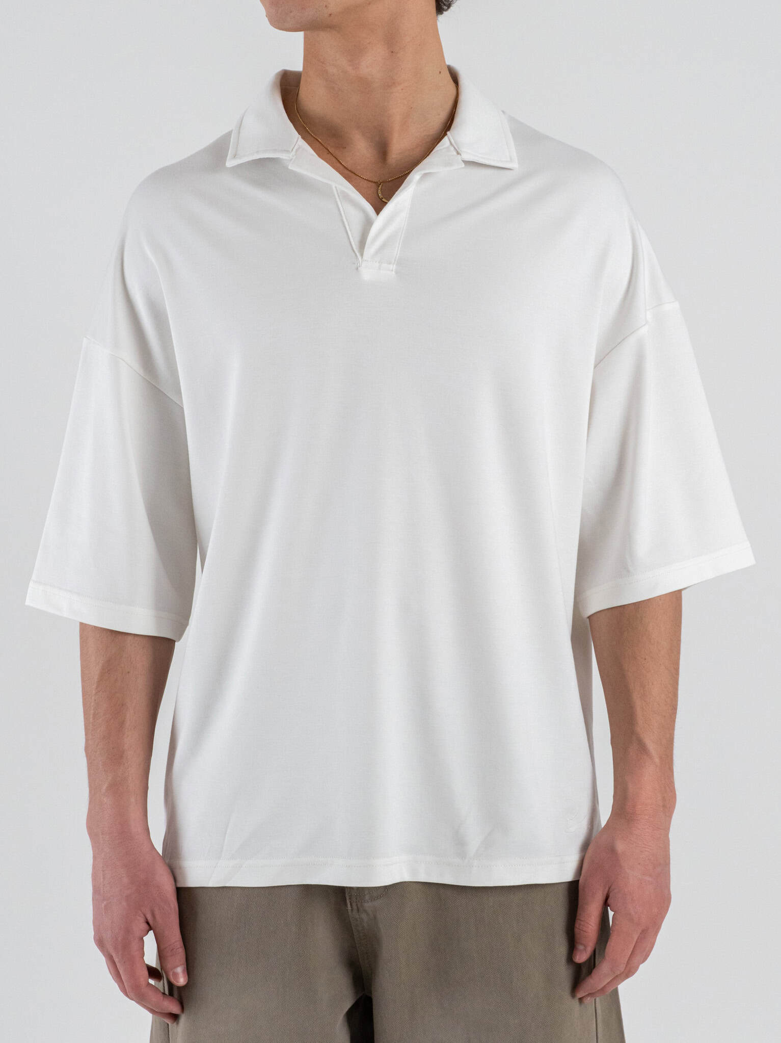 Lo scollo a V aggiunge eleganza e leggerezza al design, mentre la mezza manica garantisce comfort e freschezza. Il colore panna conferisce luminosità e versatilità, rendendo la polo facile da abbinare a jeans, pantaloni a vita alta o gonne per look casual chic e urban.