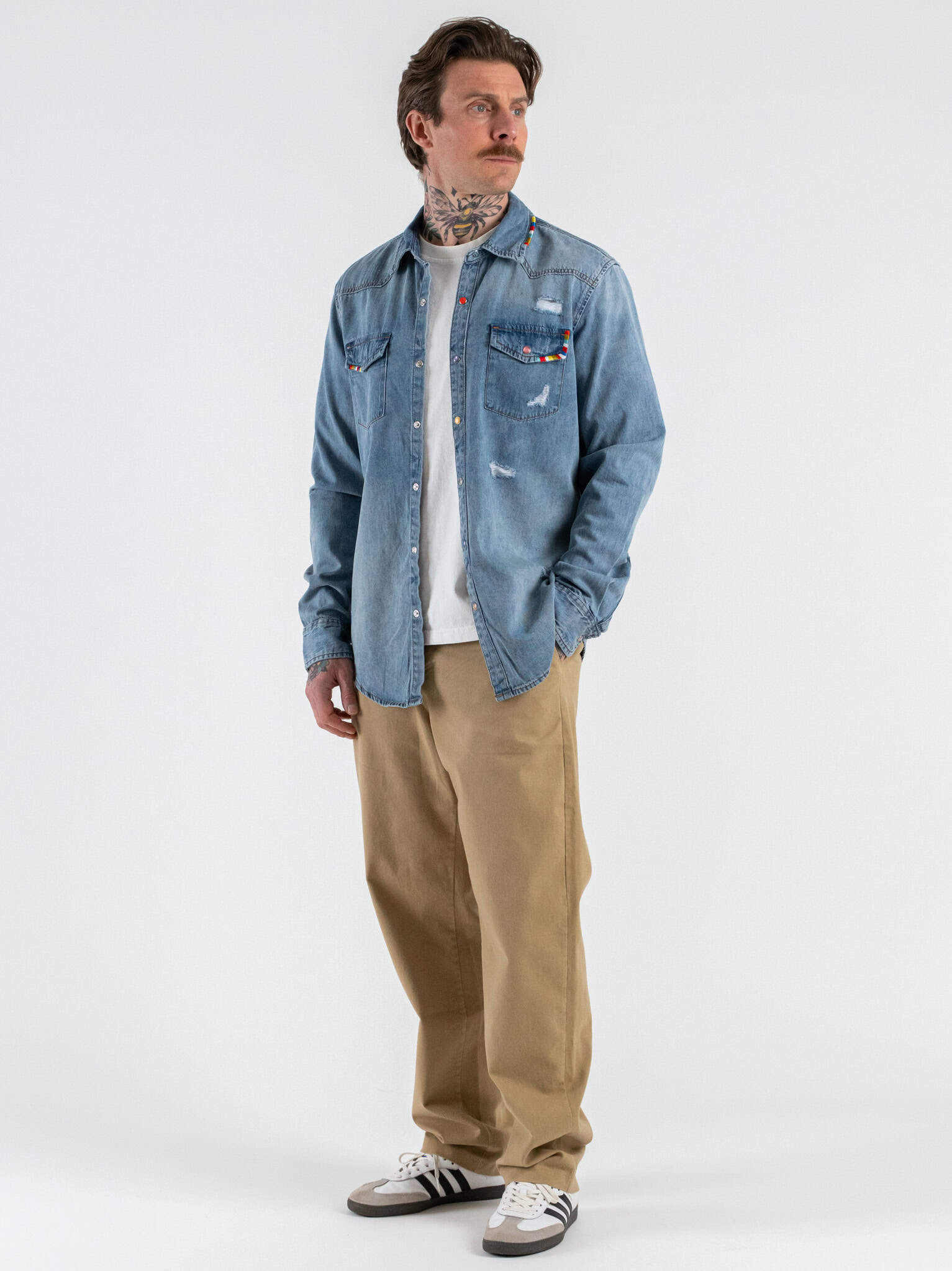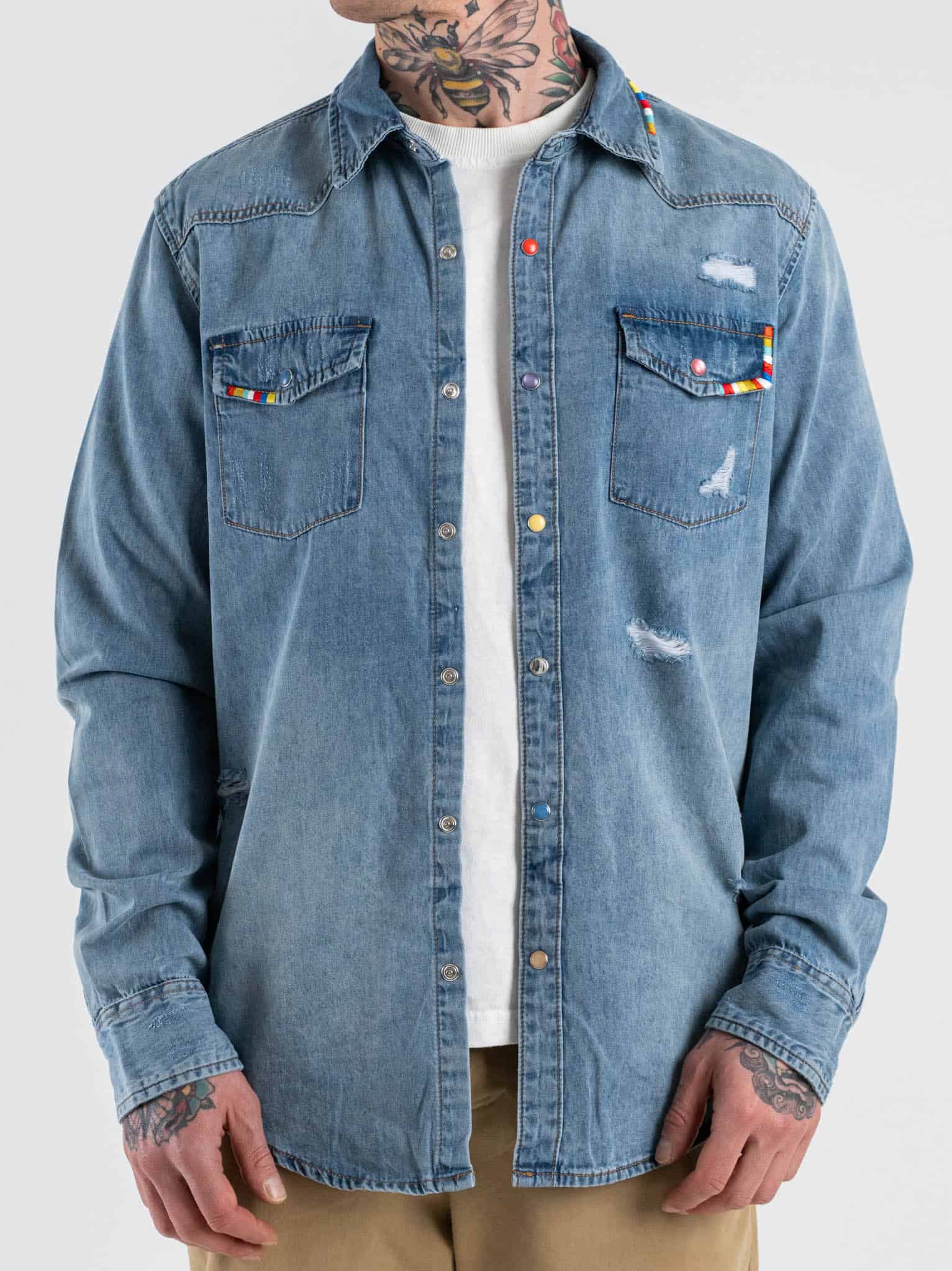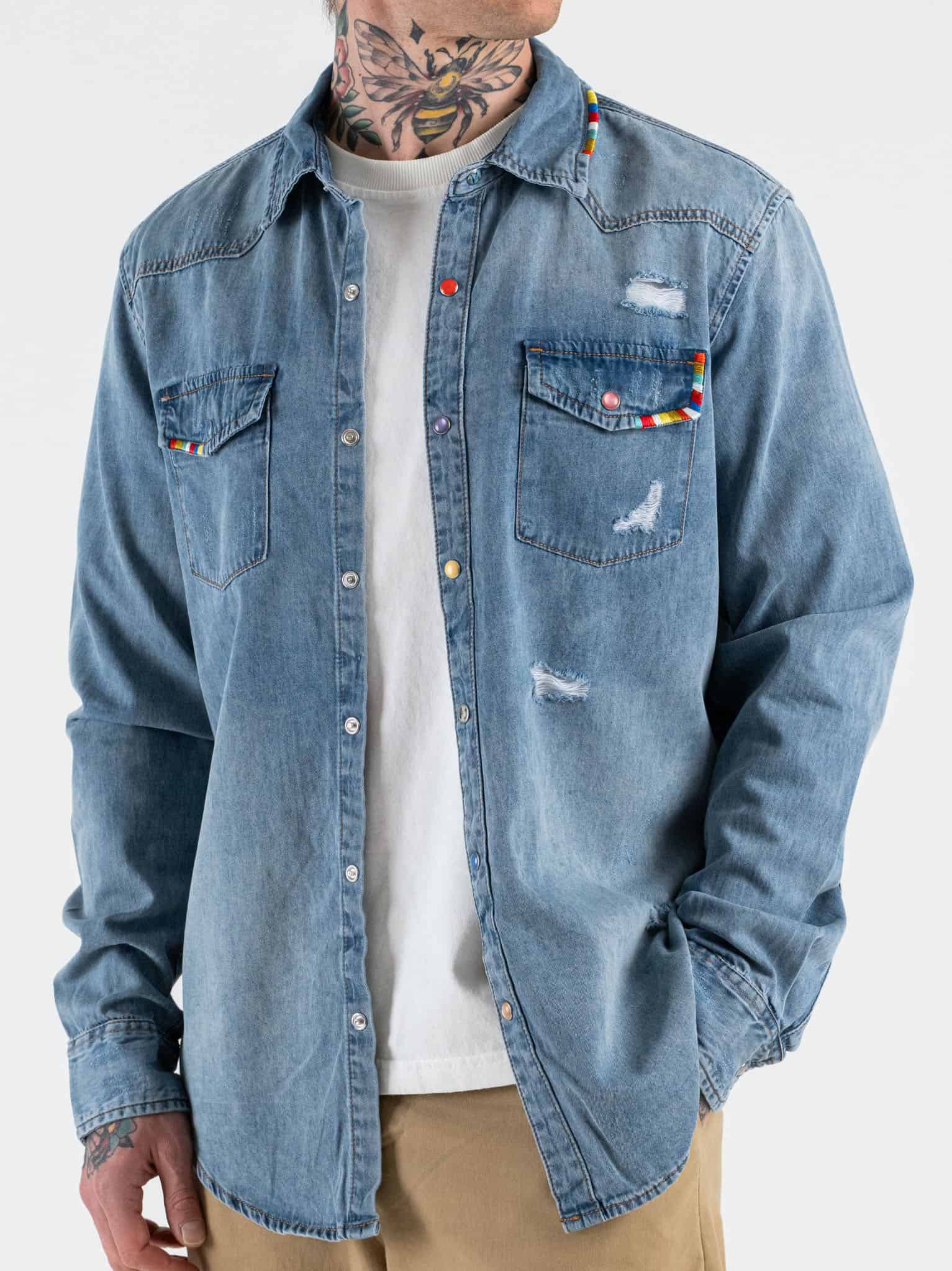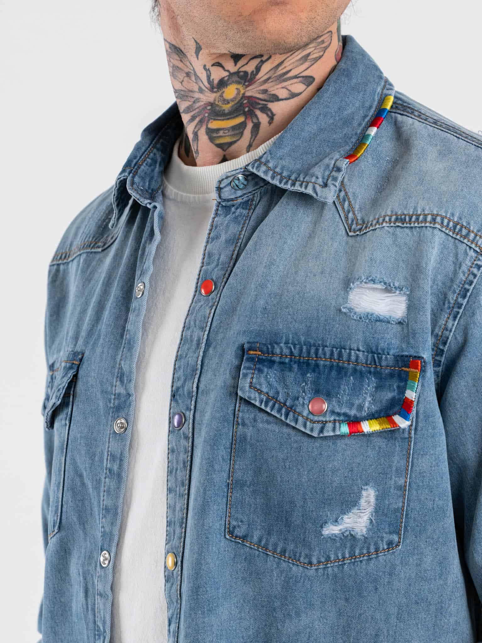 La camicia di jeans Gianni Lupo è realizzata in cotone resistente e confortevole, ideale per un utilizzo quotidiano. Il fit slim garantisce una vestibilità equilibrata e piacevole. Le rotture donano un carattere grintoso e moderno al capo, mentre i particolari colorati aggiungono un tocco originale e distintivo. Il denim mantiene un aspetto autentico e versatile. Perfetta per look casual, streetwear o outfit dal gusto urbano. Indossarla trasmette una sensazione di comfort unita a personalità e stile contemporaneo.